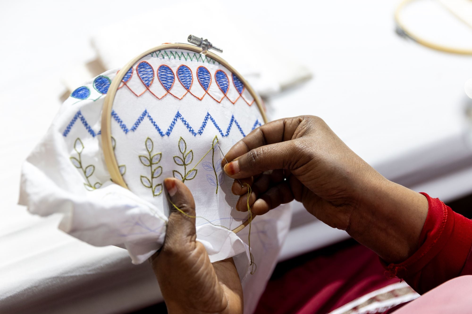 This burp cloth is made from soft, breathable cotton and finished with delicate hand embroidery that turns a daily essential into something special. Along its edge, tiny palm trees, flowers, and playful little figures are stitched in cheerful colors, bringing a touch of storybook charm to feeding time. Gentle on baby’s skin and beautifully crafted, it blends practicality with the warmth of handmade detail—a heirloom piece designed for everyday moments.